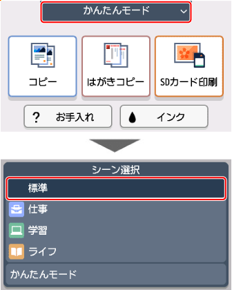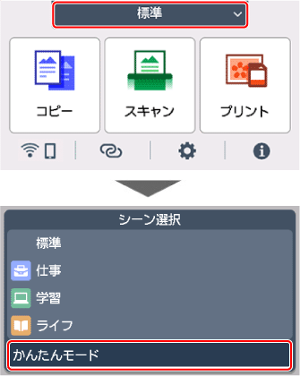 ホーム画面のシーン選択で[かんたんモード]を選ぶと、かんたんモードに切り替えることができます。