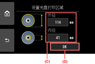 点击外径或内径(C),指定打印区域,然后点击OK(D)。