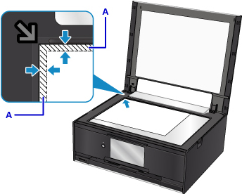Printeren kan ikke scanne det skraverede område (A) (1 mm (0,04 tommer) fra kanterne af glaspladen).