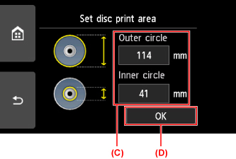 Koputage suvandil Välisring (Outer circle) või Väike sisering (Inner circle) (C), määrake prindiala ja seejärel koputage suvandil OK (D).