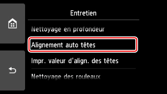 - Pour imprimer et vérifier les valeurs de réglage actuelles de la position de la tête d'impression, sélectionnez Impr. valeur d'align. des têtes sur l'écran Entretien.