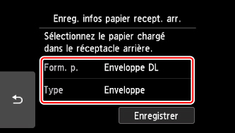 Sélectionnez la taille et le type des enveloppes chargées dans le réceptacle arrière dans Form. p. et Type, puis sélectionnez Enregistrer.
