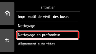 Si le nettoyage standard de la tête d'impression ne permet pas d'améliorer la qualité d'impression, procédez à un nettoyage en profondeur de la tête d'impression. Le nettoyage en profondeur de la tête d'impression requiert une plus grande quantité d'encre qu'un nettoyage normal de la tête d'impression : vous ne devez donc nettoyer la tête d'impression qu'en cas d'absolue nécessité.