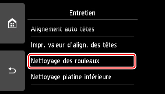 Sélectionnez Réceptacle arrière ou Cassette pour nettoyer le rouleau d'entraînement du papier.