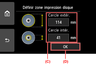 Touchez Cercle extér. ou Cercle intér. (C), spécifiez la zone d'impression, puis touchez OK (D).
