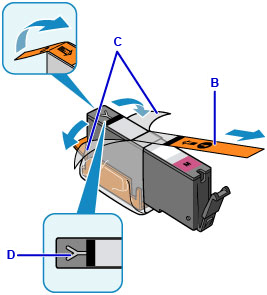 Take a new ink tank out of its package, remove the orange tape (B) completely, then remove the protective film (C) completely.