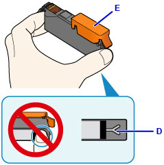 Hold the ink tank with the orange protective cap (E) pointing up while being careful not to block the Y-shape air hole (D).