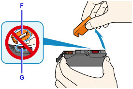 - Do not touch the inside of the orange protective cap (E) or the open ink port (F). The ink may stain your hands if you touch them.
