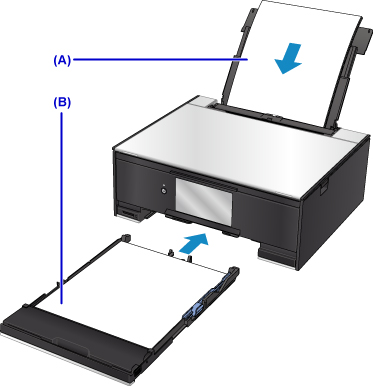 The printer has two paper sources for feeding paper, the rear tray (A) and cassette (B).