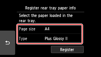 Select the size and type of the loaded paper in the rear tray at Page size and Type, and then select Register.