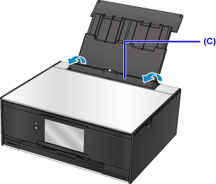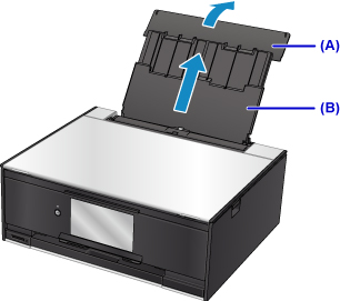Open the rear tray cover (A) and then pull up the paper support (B).
