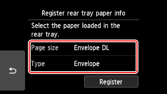Select the size and type of the loaded envelopes in the rear tray at Page size and Type, and then select Register.