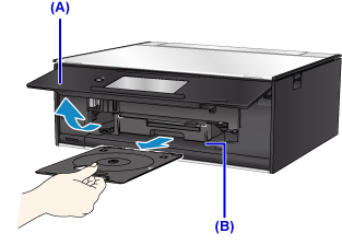 When the message asking you to load the printable disc is displayed, open the operation panel (A), and then pick out the disc tray from the disc tray storage compartment (B).