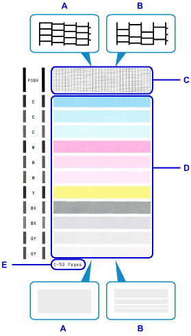 - The total number of sheets printed so far is shown in increments of 50 sheets on the printout of the nozzle check pattern.