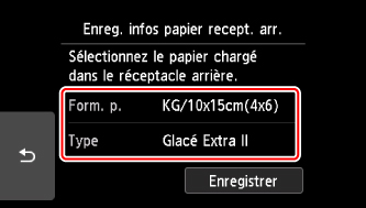 Une fois que vous avez fermé le couvercle de la fente d'alimentation, l'écran d'enregistrement des informations sur le papier pour le réceptacle arrière s'affiche sur l'écran LCD.