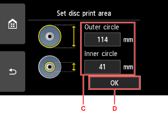 Selectaţi Cerc exterior (Outer circle) sau Cerc interior (Inner circle) (C), specificaţi zona de imprimare, apoi selectaţi OK (D).
