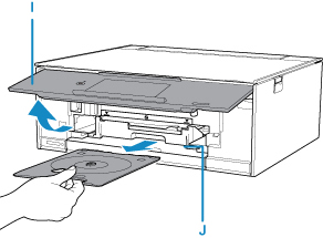 Când se afișează mesajul care vă solicită să încărcați discul imprimabil, deschideți panoul de operare (I), apoi scoateți în afară tava pentru discuri din compartimentul de stocare a tăvii pentru discuri (J).