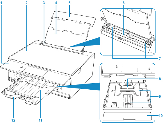 - (12) suport de ieşire a hârtiei