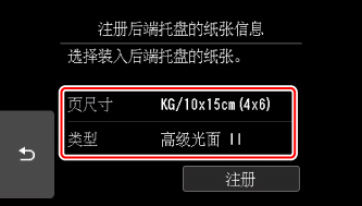 6. 页尺寸类型中选择装入后端托盘的纸张尺寸和类型,然后选择注册