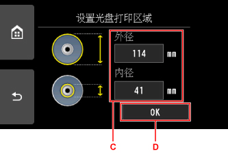 选择外径内径(C),指定打印区域,然后选择OK(D)。
