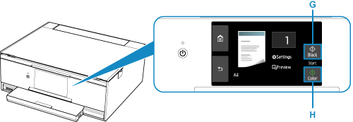 Confirmaţi setările pentru hârtie, apoi apăsaţi butonul Negru (Black) (G) sau butonul Culoare (Color) (H).