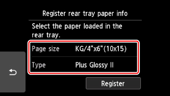 Selectaţi dimensiunea şi tipul hârtiei încărcate în tava din spate utilizând opţiunile Dim. pag. (Page size) şi Tip (Type), apoi selectaţi Înregistrare (Register).