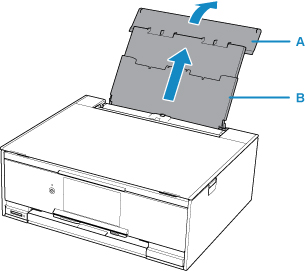 Deschideţi capacul tăvii din spate (A), apoi trageţi în sus suportul pentru hârtie (B).