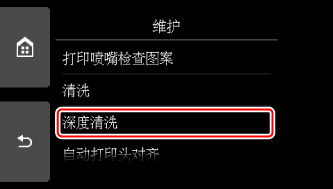 如果标准打印头清洗未改善打印质量,则深度清洗打印头 深度清洗打印头比标准清洗打印头消耗更多墨水,因此请仅在必要时深度清洗打印头