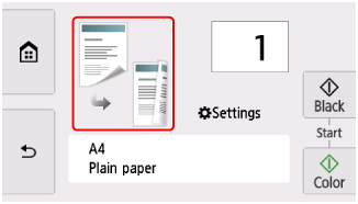 حدد Settings في شاشة الاستعداد الخاصة بالنسخ لعرض شاشة إعدادات الطباعة، ثم حدد مكان تحميل المستندات الأصلية أو إعدادات النسخ حسب طريقة النسخ على الوجهين.