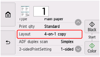 Výběrem možnosti Nastavení (Settings) na pohotovostní obrazovce kopírování otevřete obrazovku s nastavením tisku. Poté vyberte v nabídce Rozvržení (Layout) možnost Rozvržení 4 na 1 (4-on-1 copy) a nakonec vyberte možnost OK.