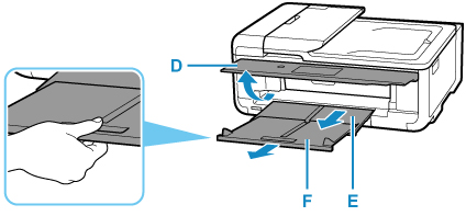 Öffnen Sie das Bedienfeld (D) und ziehen Sie dann das Papierausgabefach (E) und die Papierausgabestütze (F) heraus.