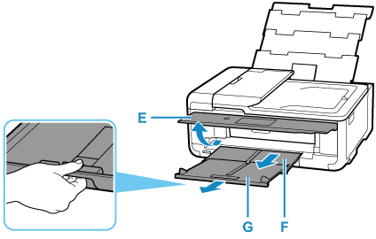 Öffnen Sie das Bedienfeld (E) und ziehen Sie dann das Papierausgabefach (F) und die Papierausgabestütze (G) heraus.