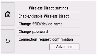 Langatt. suoran asetusluettelo (Wireless Direct setting list) -näyttö tulee näkyviin.