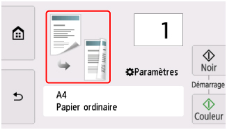 Sélectionnez Paramètres dans l'écran d'attente de copie pour afficher l'écran des paramètres d'impression, puis spécifiez l'emplacement de chargement des originaux ou les paramètres de copie dans le cas d'une copie recto verso.