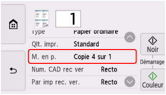 Sélectionnez Paramètres dans l'écran d'attente de copie pour afficher l'écran des paramètres d'impression, sélectionnez Copie 4 sur 1 pour M. en p., puis OK.