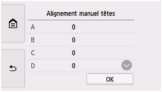 Sélectionnez Impr. valeur d'align. des têtes pour imprimer et vérifier les valeurs d'alignement actuelles de la tête d'impression.