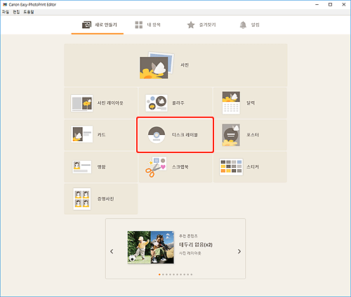 1Easy-PhotoPrint Editor를 시작하고 디스크 레이블(Disc Labels)을 선택합니다.