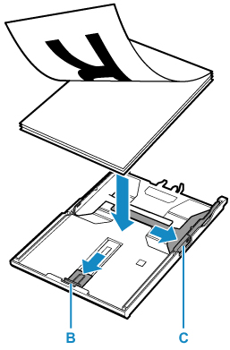 Stumdami dešinįjį popieriaus kreipiklį (C) sulygiuokite jį su popieriaus šūsnimi.