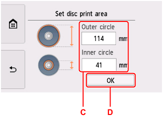 Selectaţi Cerc exterior (Outer circle) sau Cerc interior (Inner circle) (C), specificaţi zona de imprimare, apoi selectaţi OK (D).