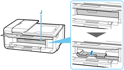 Deschideţi ghidajul tăvii multifuncţionale (J) şi apăsaţi-l complet în jos.