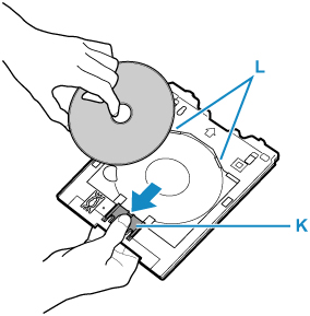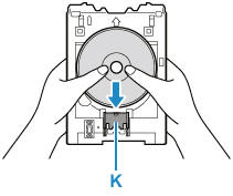 將列印面向上,緊靠底部的擋板(K)向下按可列印光碟,以裝入可列印光碟。