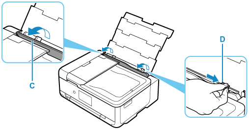 Trượt thanh dẫn giấy bên phải (D) để mở các thanh dẫn giấy.