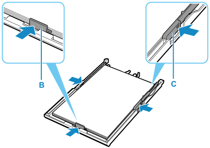 Trượt thanh dẫn giấy (B) ở phía trước và (C) ở bên phải để mở các thanh dẫn.