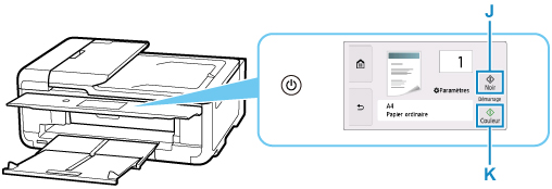 Vérifiez les informations concernant le papier et touchez Noir (J) ou Couleur (K).