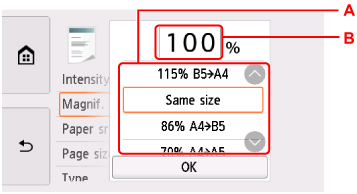 Kopēšanas gaidstāves ekrānā atlasot Iestatījumi (Settings), tiek parādīts tālāk redzamais ekrāns, un atlasiet Palielin. (Magnif.), lai atlasītu samazināšanas/palielināšanas metodi. Norādiet palielinājumu un pēc tam atlasiet Labi (OK).