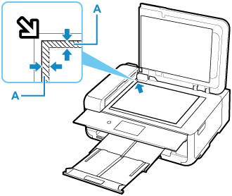 เครื่องพิมพ์ไม่สามารถสแกนพื้นที่ที่มีแถบ (A) (1 mm (0.04 in) จากขอบของกระจกแท่นวาง)