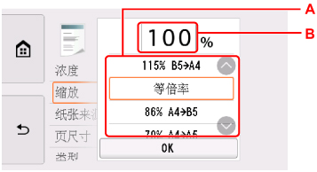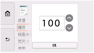 在复印待机屏幕中选择设置后显示以下屏幕,然后选择缩放以选择缩小/放大方式。 指定缩放倍率,然后选择OK。