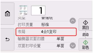 在复印待机屏幕中选择设置以显示打印设置屏幕,为布局选择4合1复印,然后选择OK。