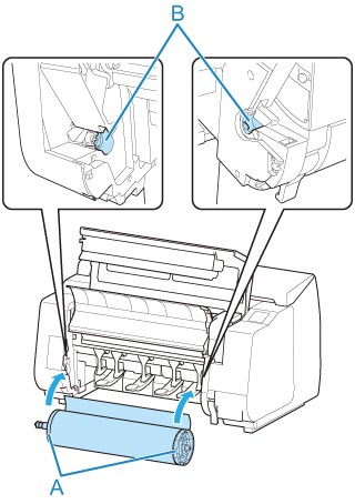 Veillez à ne pas vous coincer les doigts entre l'arbre du Support du rouleau et les guides (B) lors du chargement du rouleau.