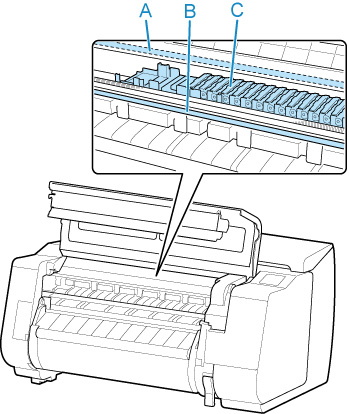 Ne touchez pas l'échelle linéaire (A), le rail du chariot (B) ou le stabilisateur de tube d'encre (C). Vous risqueriez de causer un dysfonctionnement.